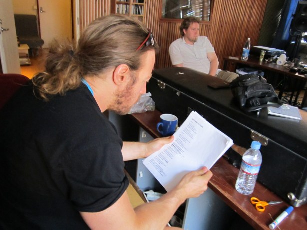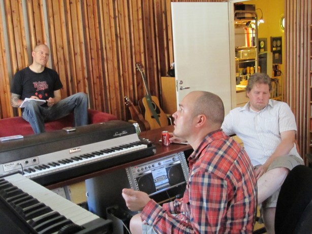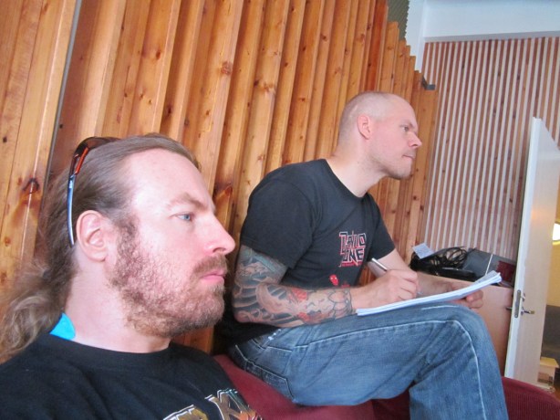 Band bassist Jouni Weckman listens to the song playing in the background as I check the lyrics